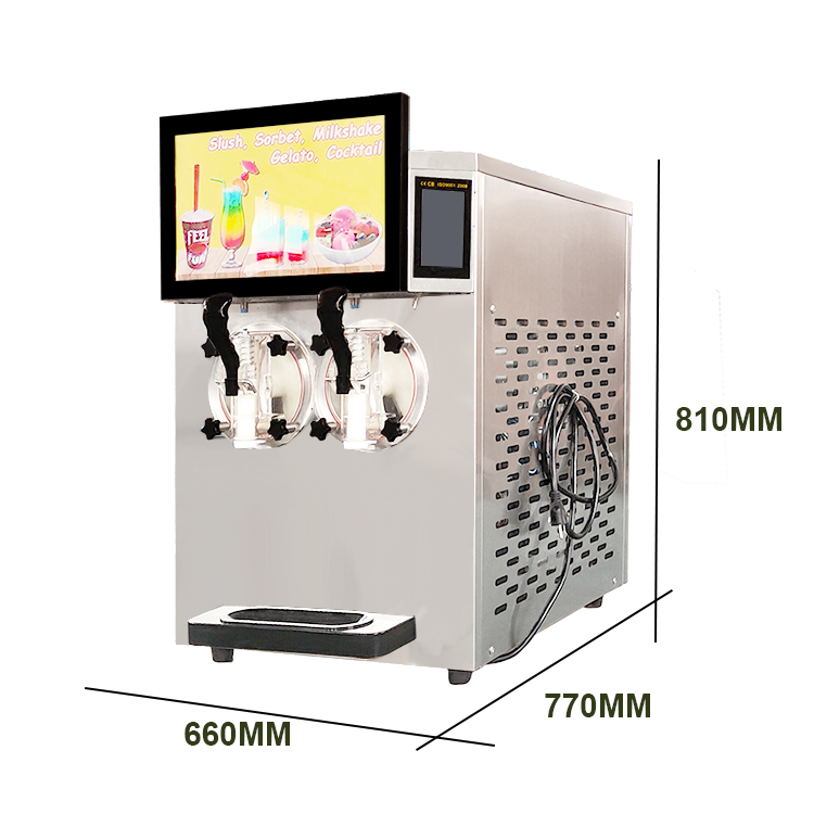 Stainless Steel Frozen Drink Daiquiri Cocktail Slush Machine Pro-taylor new design daiquiri machine, can serve Smoothie Slush, Ice Coffee, Cocktail, Ice Cream, Gelato, Sorbet and Milkshake. All in 1 machine! Product Feature: 1, Multifunctional, can make (Carbonated) Slush, Daiquiri, Cocktail, Soft Ice Cream, Gelato, Sorbet, Milkshake 2, Stainless Steel 304 mixture hopper and cylinder, healthy and durable 3, With brand new powerful compressor, fast cooling, each production batch only takes 10-20 minutes. 4, Touch screen control, easy to operate 5, With keep fresh function and auto-produce mode 6, With advertisement light box…