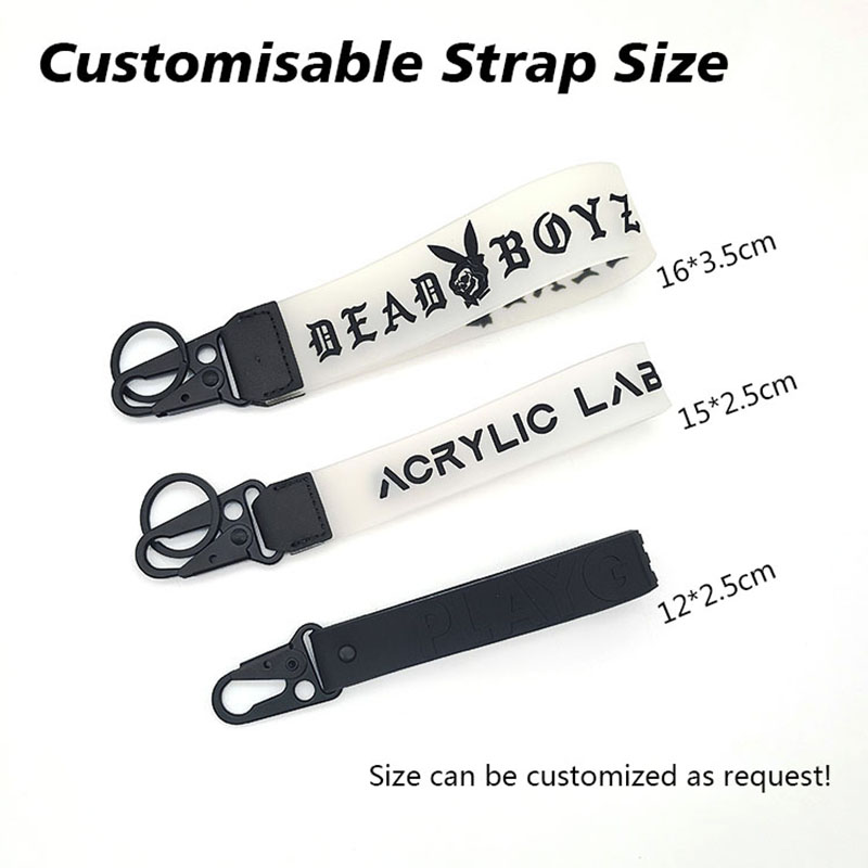 How long should a wristlet strap be? Available in any pantone color, these functional stylish leather key chains are a sure winner. The thick rubber material is built to last, and durable buckle and keyring accessories, this Cute Wristlet Key Chain makes the perfect gift, or corporate promotional gift. We can add any name, slogan and shapes to the strap. Big bulk discounts or try MOQ 100pcs today. 100% GUARANTEED. Personalised gifts are shipped all over the world. North America, (USA, Canada) UK, Australia, Europe, Asia, South America etc. ...... Any part of any of designs can be placed on your choice of thousands of customisable products. Make it yours today - in both senses of the word! Dimensions: 1.38" w x 5.9" l(or customized) Designs raised on soft rubber strap Minimum order quantity is 100 units per design. Finished with a PU connector and Metal Keyring to hold keys Attached it to your wallets, b…
