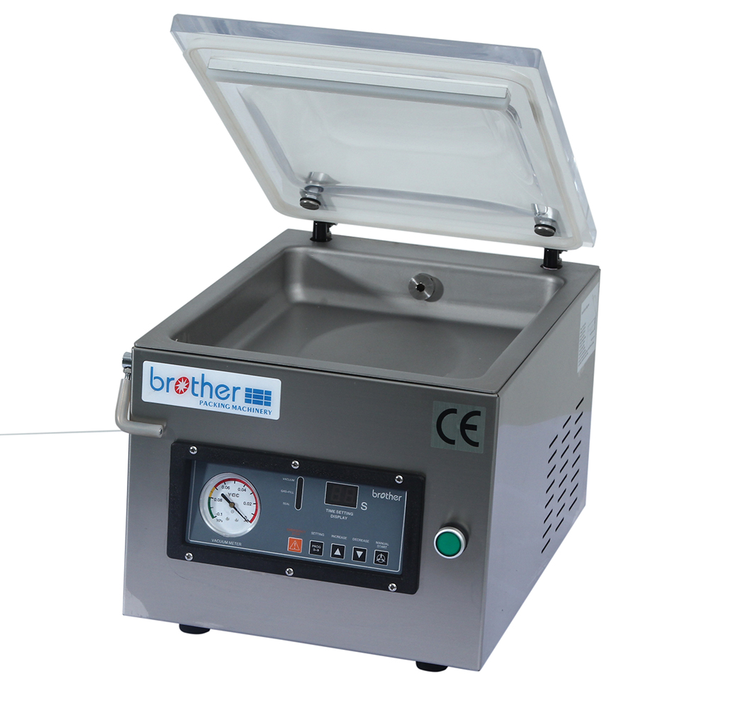 Product Description ModelVMQ400TE/B Power supplySinghle Phase , 110V or 220-240V/50-60Hz Motor Power900WSealing Power500WChamber size440×420×75mmSealing bar sizeDouble sealing-bar, 400×10mmVacuum Pump20m3/hMachine size560×500×460mmMachine weight90kg FEATURESThe products after packing can be prevented from oxidation, going mould, insects or getting damp, thus can be kept fresh for longstorage . The machine hull and Vacuum chamber are made of stainless steel.Aviliable for food product packing. The lid isAcylicGlass. It is easy in operation. Machine can finish the whole programs of vacuum extraction, gas flushing (optional), sealing,cooling and opening cover automatically. Related Products view more >>Related ProductsBrother Packing V9 Home Food Mini Vacuum Sealer Packing Sealing Machine$14.00 - $16.00 / Unit1 UnitBrother Mini Food Vacuum Sealer Machine,House Chicken Handhel…