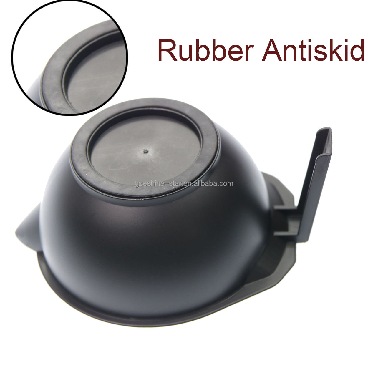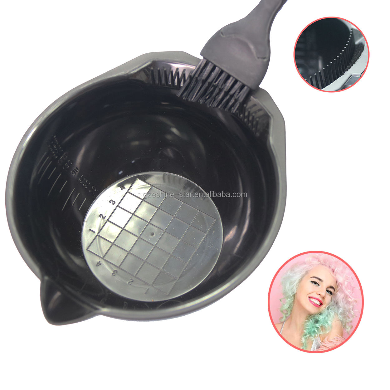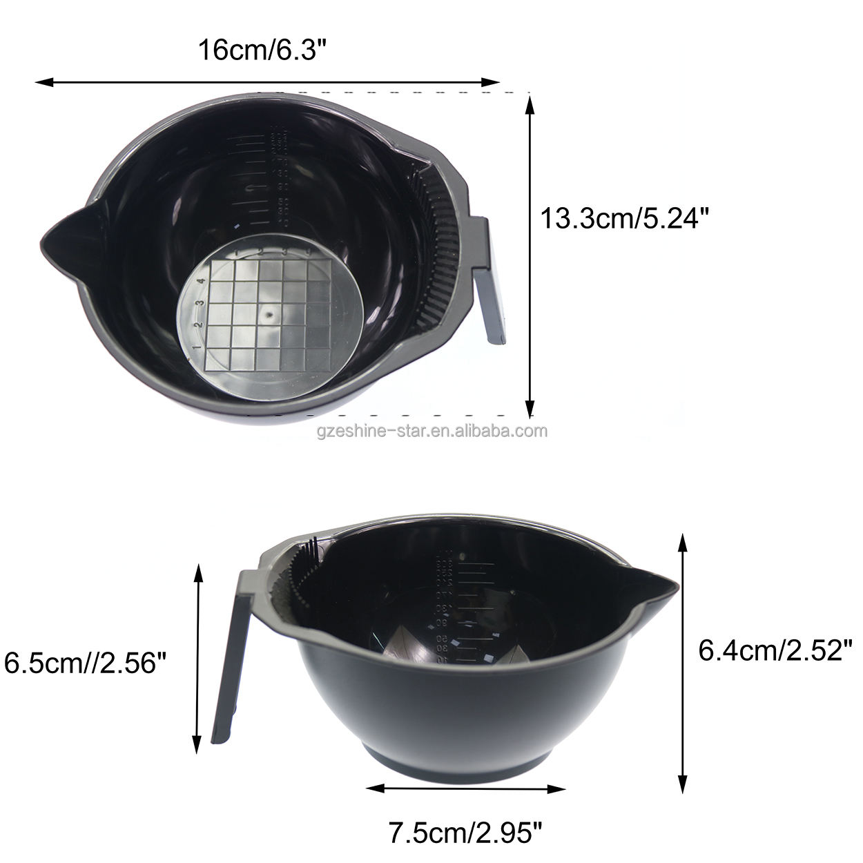 This product is made of corrosion-resistant and easy-to-clean PP plastic. The material is non-toxic, odorless, harmless to the human body, safe and reliable. The inside of the dye bowl is marked with scale marks, which is convenient for mixing the proportion of hair dye during use to avoid waste. The bottom of the dye bowl is installed with a non-slip silicone ring to prevent sliding during use and ensure stability and reliability during use. The surface of the dye bowl is smooth and not easy to leave dye residue. It can be cleaned by rinsing with clean water and is reusable. This dye bowl also has a toothed design, which is convenient for the dye sweep to control the dosage of the dye. The ergonomic handle is easy to hold and hold during the application process and when mixing colors; it has a rubberized bottom and measuring scales in the mold of the bowl. It is an easy-to-pour spout suitable for home self-service hair dyeing, hair salons, professional barber shops, makeup training s…