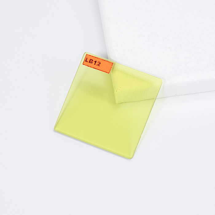 Absorption type green optical glass LB12 is a high-performance filter material, with the following core characteristics: (Choose absorption type orange glass,Choose absorbent insulating glass,Choose absorption type color temperature reducing glass,Choose absorption type blue blue glass) Spectral characteristics Selective transmission is achieved in the green wavelength range (typical center wavelength of about 500-570nm), which can efficiently transmit green light and cut off other visible light bands (such as red and blue light). Suitable for extracting specific green light from white light or multi wavelength light sources, or for color correction. Physical and Chemical Properties Using high borosilicate or high alumina silicate glass substrates, it has good thermal stability and can maintain its optical properties unchanged over a wide temperature range. After strengthening treatment, it has high mechanical strength and impact resistance, and can withstand a certain degree of exte…
