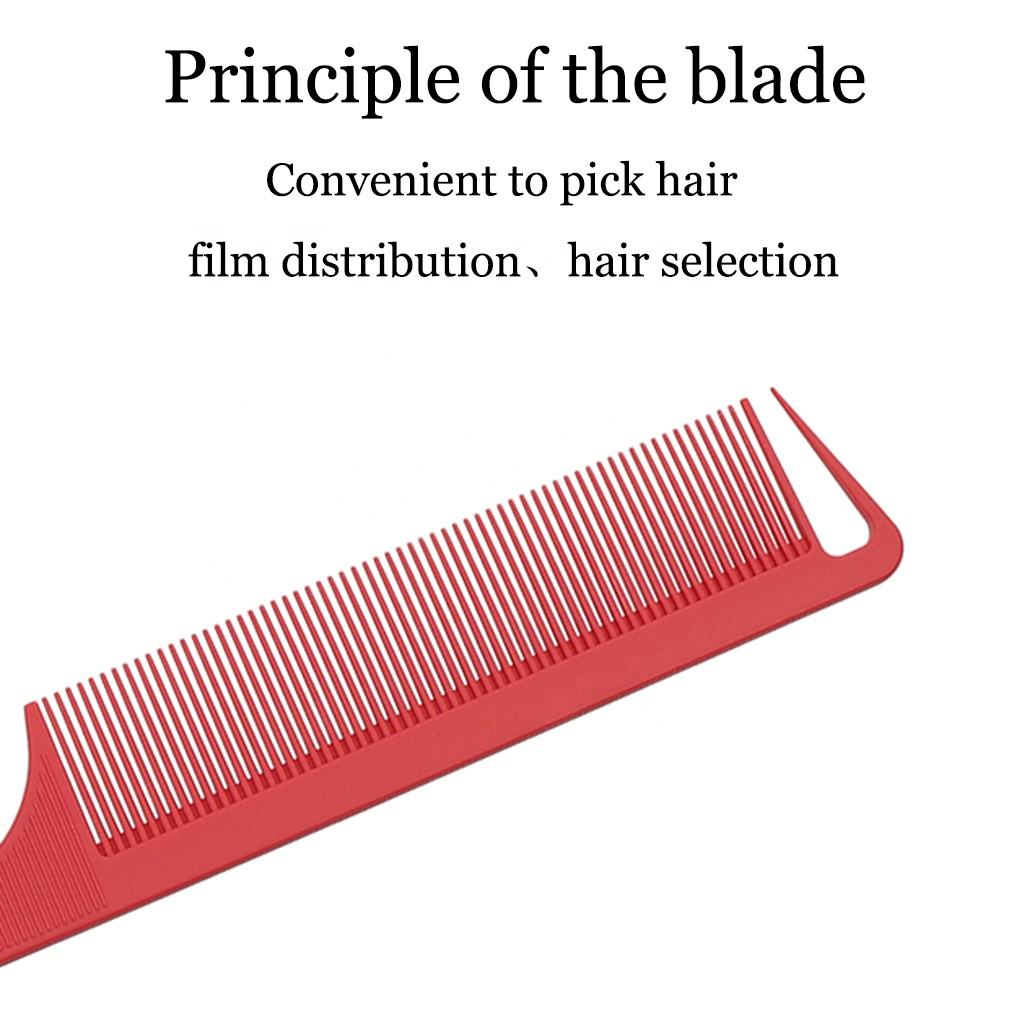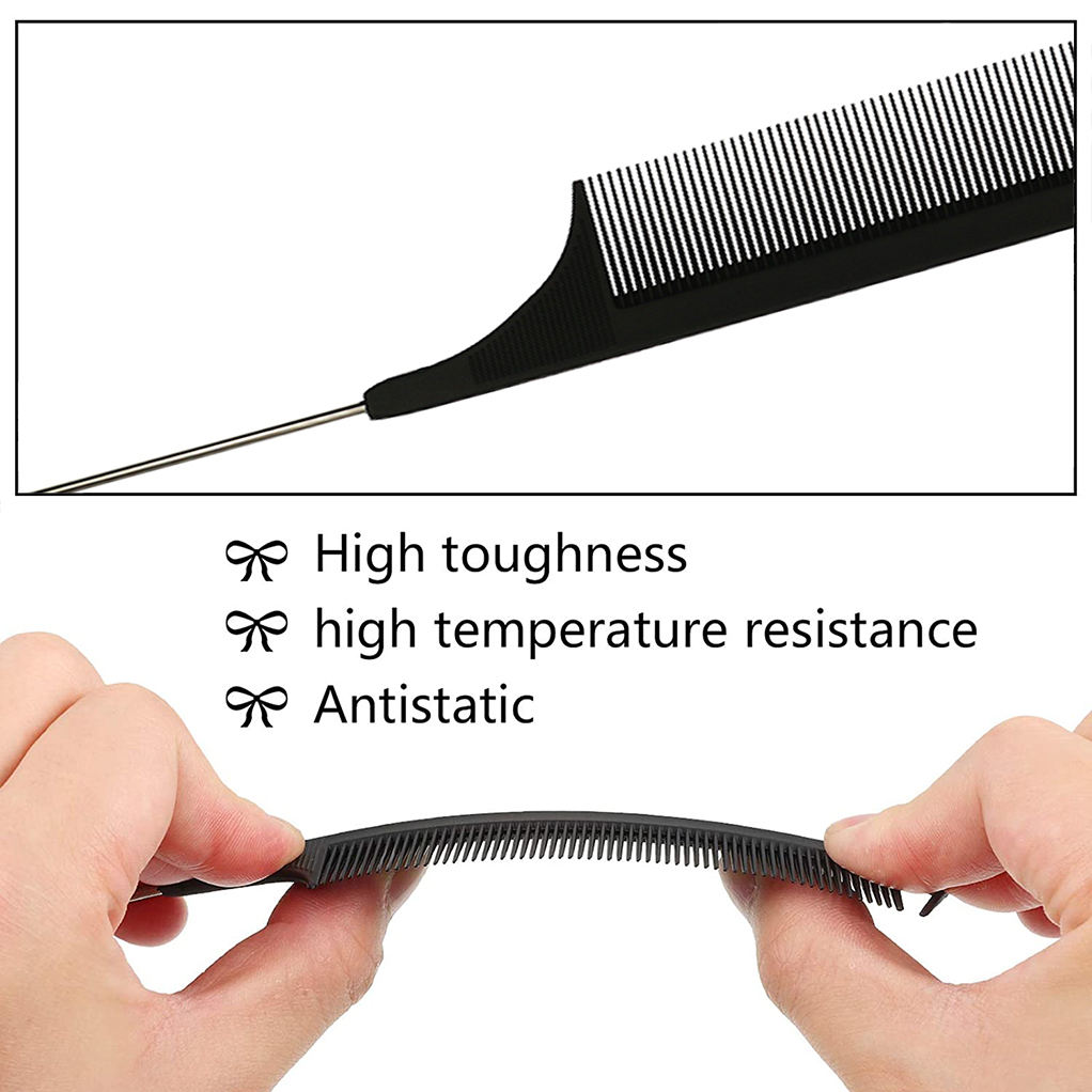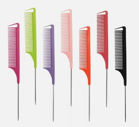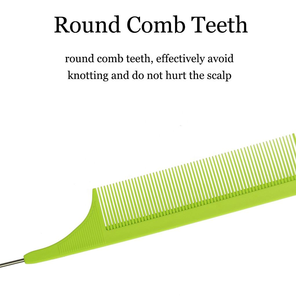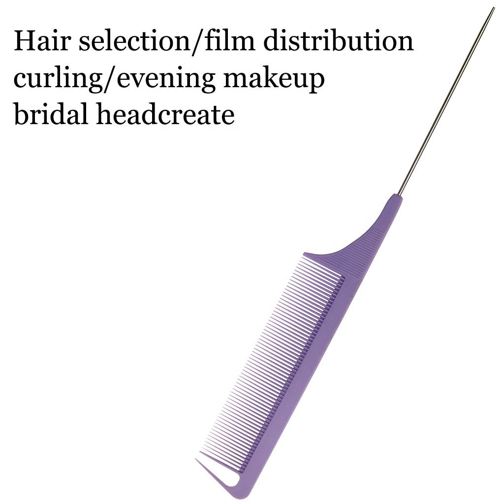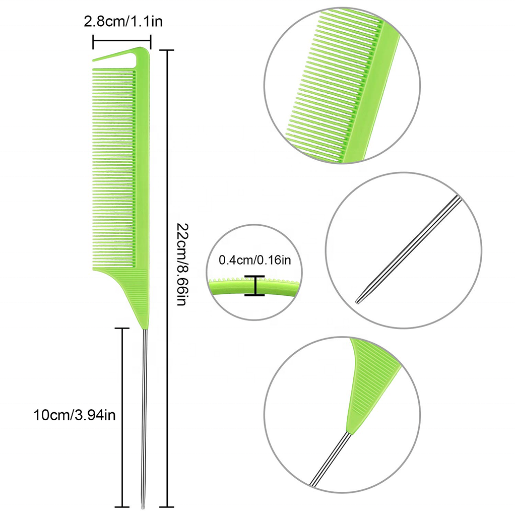 Overall dimensions: 8.66" x 1.1" Metal tip length: 3.94" Thickness: 0.16" This is a steel tip texturizing comb. We offer custom colors and can print your logo on the back. This product is made of internationally recognized high-temperature-resistant materials, resistant to 230°C. The teeth are highly rigid and flexible, and are corrosion-resistant, acid- and alkali-resistant. A rounded brush protects the scalp. The most striking feature of this comb is its pointed tip, perfect for highlighting and layering hair. The front teeth are used for parting and straightening layered hair. Useful for: It's an excellent tool for evening makeup, styling, and fine-detangling hair.