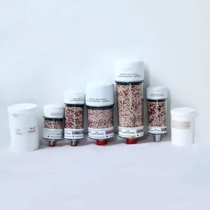 Dehumidification filter SGB-120-03-B SDB-121 322769 WP125-130 Breathing filter. Desiccant respirators are a key component to protect the quality of lubricants widely used in gearboxes, oil storage tanks, transformers, hydraulic stations and other equipment. Due to the thermal expansion and contraction of lubricants inside these devices, they cannot be sealed and must be able to balance with atmospheric pressure. Dehumidification is essential to ensure that the air entering the equipment is clean and dry. Technical Parameter P/N Replace Brand Filter mic. Working Tepm. Dosage of Desiccants Water Absorption Filter Area Connection size DC-1 DES-CASE 3μm -29℃~93℃ ≥0.127kg 0.0497L 24 cm² 3/8"(NPT,BSPP,BSPT) DC-2 DES-CASE 3μm -29℃~93℃ ≥0.3kg 0.1182L 74cm² 1"(NPT,BSPT) DC-3 DES-CASE 3μm -29℃~93℃ ≥0.56kg 0.2203L 74cm² 1"(NPT,BSPT) DC-4 DES-CASE 3μm -29℃~93℃ ≥0.84kg 0.333L 74cm² 1"(NPT,BSPT) SDB-093 STAUFF 3μ…