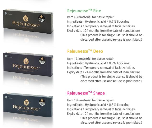 Rejeunesse with idocaine is a sterile, transparent, pyrogen-free, viscoelastic gel of 100% cross-linked hyaluronic acid of non-animal origin containing 0.3% idocaine hydrochloride for treatment of wrinkles and folds. The idocaine provides the patient's pain reducing effect during treatment. SAFETY. Non-animal hyaluronic acid & no residual crosslinker. Rejeunesse is non-animal based, cross linked dermal filler using BDDE for linking agent. Rejeuness product is obtained through our unique BDDE removal process, making it safe and non carcinogenic for humans. Rejeuness contains less than 1.2EU/ml of endotoxins with no BDDE residue detected and it exceeds the highest level of HA purity. Rejeunesse is completely free of all animal products thus reducing the risk of an immunogen…