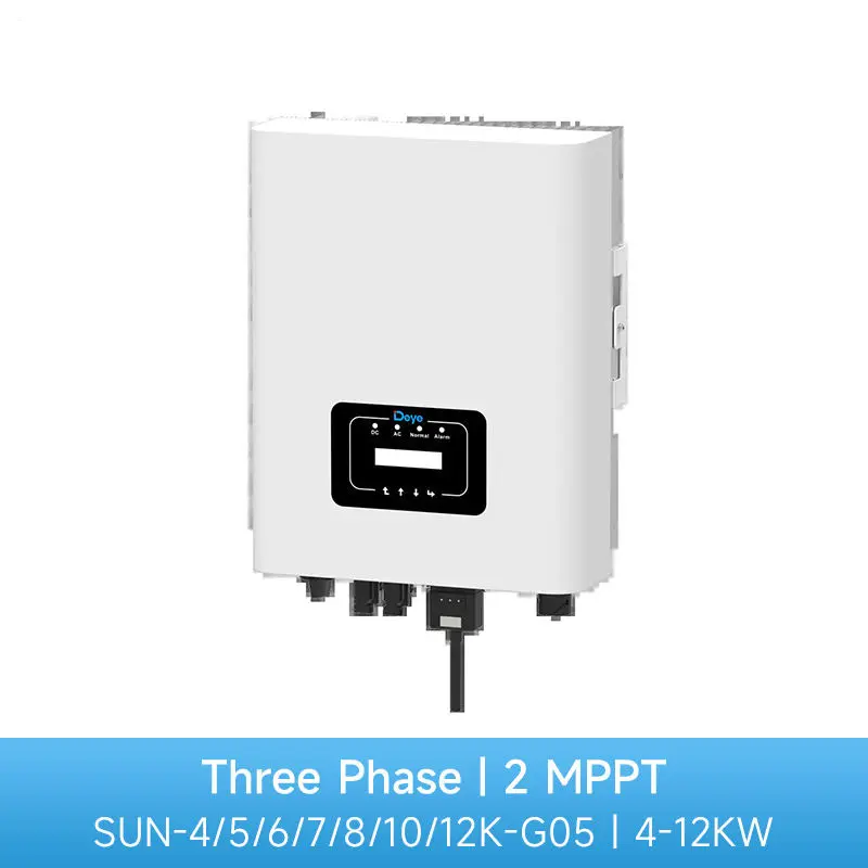 Description Higher yields / Safe & Reliable / Smart / User-friendly This series inverter is specially designed for three-phase PV systems, covering a wide power range of 4kW, 5kW, 6kW, 7kW, 8kW, 10kW, 12kW. With compactness design, it is easy to install and operate. It supports wide AC output voltage to ensure longer working hour. 10kw on grid solar inverter. Deye 12kw solar inverter for solar system. commercial use 10kw solar inverter. Remotely shutdown function Smart Monitoring Platform Thanks to the smart monitoring platform, Deye full series inverter products support remotely shutdown immediately when accident occurs.Setting parameters and FW update remotely, which makes PV plant O&M easier. 2 MPP tracker, Max. efficiency up to 98.3% (1)Zero export application, VSG application (2)String intelligent monitoring (optional) (3)Wide output voltage range Model S…
