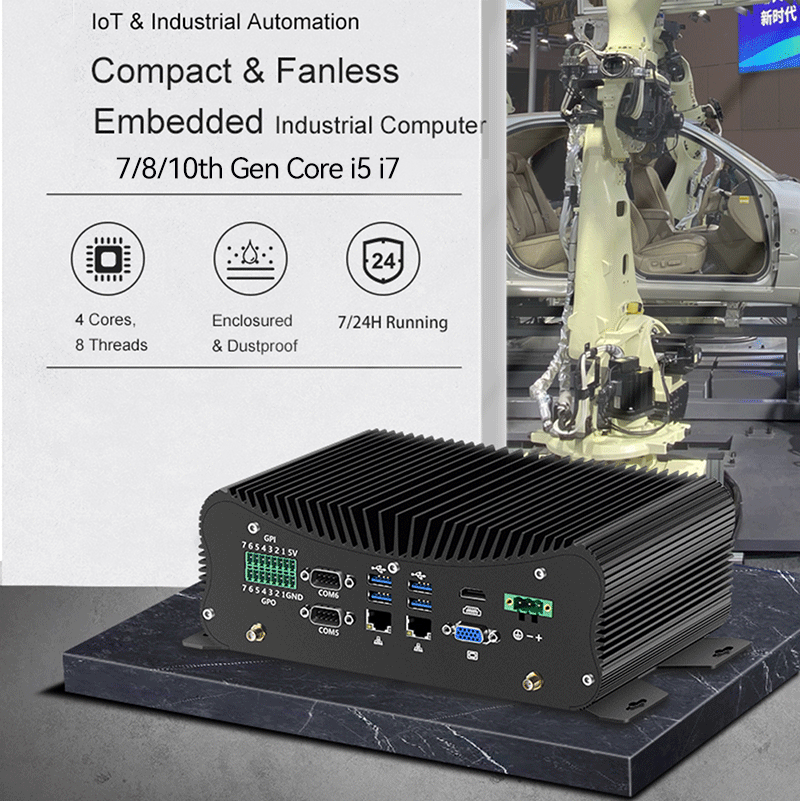 Embedded Industrial computer offers a high level of performance and low level of power consumption. Used for data computing, remote monitoring, and the integration of hardware and software technologies, the fanless industrial PC is ideal for computing solutions for tight spaces because fanless industrial computer is designed with small footprints and multiple I/Os. Our entire line of industrial computer: Fanless, which reduces maintenance costs and minimizes downtime;Sealed, so they are resistant to dust, debris, and fluids;Noiseless, since they use a passive cooling system instead of fans. With its bus structure and modular design, the IPC can be better shielded from external interference and will operate more stably. This is a industrial mini PC. Product Details CPU: Intel Core Core i5 4278U 7267U 7360U 8250U 8265U 8269U 8365U 10210U. Intel Core i7 7500U 7560U 7600U 8550U 8565U…