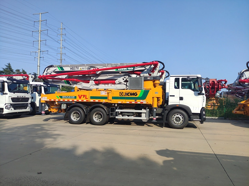 Basic lnfo. Product Description XCMG V7 series truck mounted concrete pump is equipped with ultimately safe boom, lower structure of high rigidity, efficient pumping system of rock valve, hydraulic system of outstanding performance, intelligent control system and easy-wear parts with super-long service life. 1.Concrete machinery adoption of new multi-section boom design optimized by bionic technology effectively reduces placing blind zone and better adapts to placing in high-rise and narrow space. 2. On the basis of the design concept of high rigidity structure, simulative calculation and testing of full-work-condition loading make chassis structure deformation smaller and overall work stability higher. 3. Based on laser guide, coaxial assembly makes piston head's moving track more precise, with smaller resistance and higher efficiency. 4. SCHWING Germany's hydraulic technology quintessence truly realizes fully-hydraulic reversing, in which self-ada…
