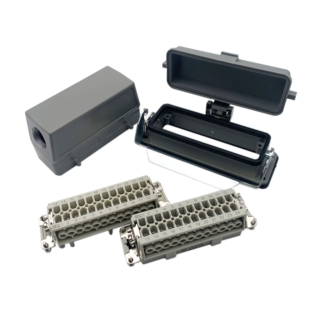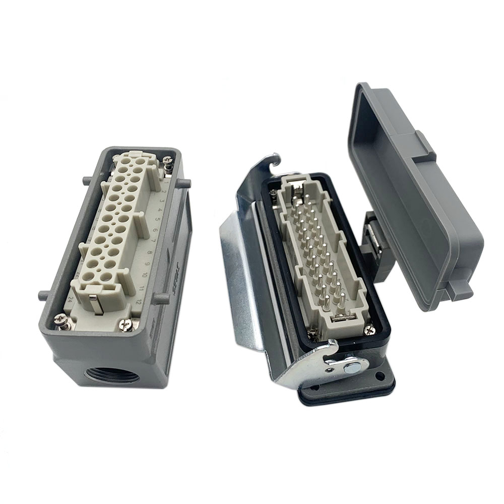 Quick Disconnect Heavy Duty Electrical Connectors Realize pre-installation, pre-installation of a large number of complex and miscellaneous circuits, which can greatly improve the efficiency of equipment installation and reduce the rate of wiring errors. Heavy Duty Connector provide highly integrated connections, and the rich combination methods improve the effective utilization of equipment space. The high protection level provided by the heavy-duty connector is incomparable for the advantages of the equipment connection system in harsh environments. Provide effective protection in harsh environments such as dust, rain, cold, ice and snow, oil pollution, etc. In addition to heavy-duty connectors, we have other industrial connectors, such as M12 Connector, M8 Connector. Name: HE 24Pin Heavy Duty Connector Pin count: 24 Gender: Male…