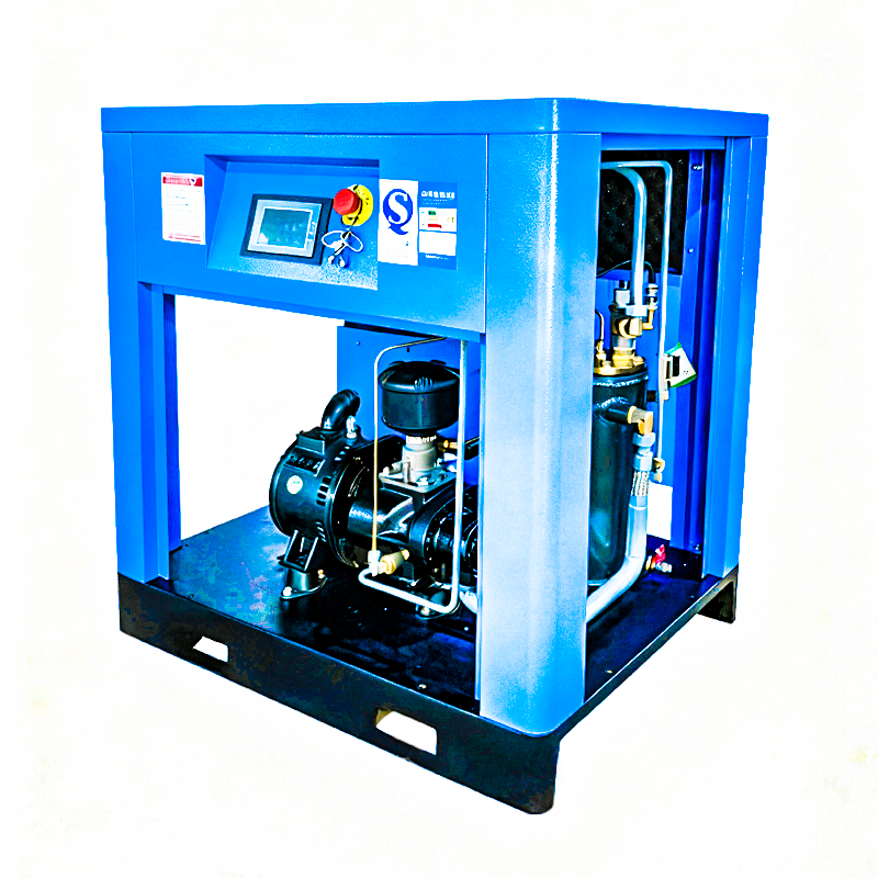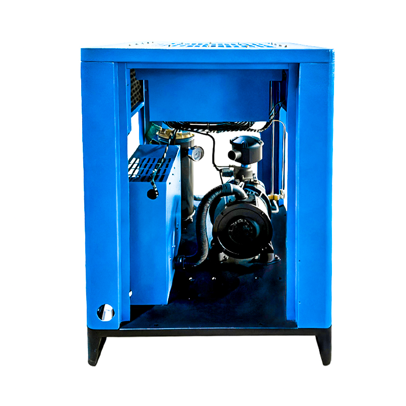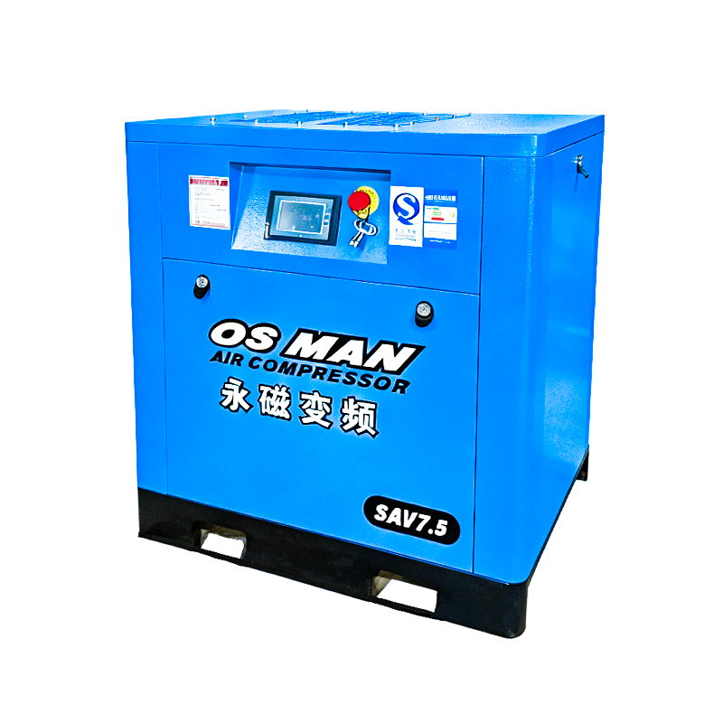 This machine is our permanent magnet variable frequency air compressor, which uses a three-phase rare earth permanent magnet synchronous motor, abbreviated as PMSM. The three-phase rare earth permanent magnet synchronous motor belongs to asynchronous starting synchronous operation, and the rotor is rare earth treated, so there is no slip S, no electrical excitation, and no fundamental iron or copper losses in the rotor, i.e. PFE2=0, PCU2=0. The rotor is excited by a permanent magnet bowl, without the need for reactive excitation current. The power factor is improved, the reactive current is reduced, the stator current is significantly reduced, the stator copper consumption is greatly reduced, and the power is significantly increased. From this, it can be seen that rare earth permanent magnet motors are truly energy-saving, distinguishing them from power frequency models. Under our laboratory testing, the data shows that a 7.5KW machine can run for 5800 or 8000 hours a year with an ave…