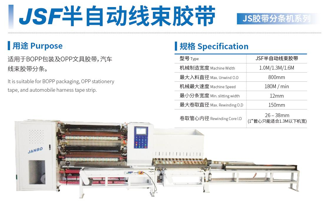 JANBO Tape Slitting Machine Summary: The JANBO Tape Slitting Machine is a versatile piece of equipment designed for cutting and rewinding various types of tapes, including BOPP packaging tape, OPP stationary tape, harness tape, electronics industry tape, solar energy industry tape, masking tape, film tape, and PVC electrical tape. Key Features: - Semi-automatic machinery for efficient tape slitting - Suitable for a wide range of tape materials - Precision cutting and rewinding capabilities - Ideal for the electronics and solar energy industries - Converting device for all kinds of sticky tapes Detailed Description: The JANBO Tape Slitting Machine is equipped with advanced technology to ensure accurate and efficient cutting and rewinding of tape rolls. It is perfect for various industries, including electronics and solar energy, where high-quality tape products are essential. The machine can handle different types of tapes, making it a versatile tool for any production environment. Usag…