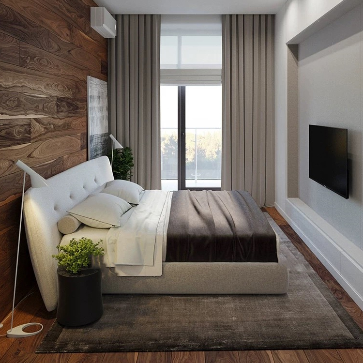 This contemporary bedroom features a modern bed with a generously wide headboard, crafted from soft and cozy fabric. The bed stands prominently in the middle of the room, dressed in a gray bed sheet and paired with a brown blanket for added warmth. The large gray headboard, with its ample padding, not only offers support but also adds a sense of coziness to the bed. Next to the bedhead, a sleek bedside table hosts a minimalist lamp, providing a soft, ambient glow. A book resting open beside the lamp suggests a relaxing reading session. A small black side table is positioned on the opposite side of the bed, also adorned with a tasteful lamp. At the foot of the bed, a circular rug in a coordinating hue sits neatly, grounding the bed and complementing the overall color palette. A large window in the background, with its curtains partially drawn, allows natural light to filter into the room, creating a bright and airy ambiance. Overall, t…