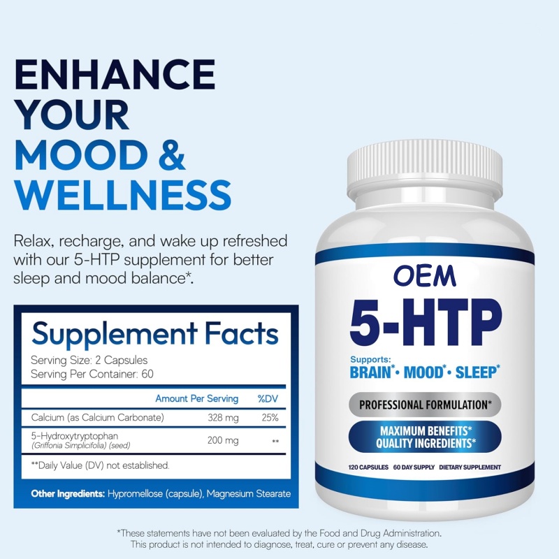 Our 5-HTP Capsule comes in 120 capsules per bottle, providing a 60-day supply. In addition to 100mg of 5-HTP per capsule, each serving also contains an additional 328mg of calcium. The enhanced super formula can significantly improve the depth and duration of sleep and promote more restful and peaceful sleep; supporting the conversion of 5-HTP in the body. Bringing immediate benefits of improving mood and sleep. We use a powerful formula with ultra-high purity of 99%, and the highest standards ensure that our supplement ingredients are safe, nutritional value and label accuracy is trustworthy. Product Name 5-HTP Capsule Appearance Customized Origin of Capsule Veg capsule Capsules Size This product is 00#,we also provide 2#, 1#, 0#, 000# or as your request. Capsules Content This product is 264mg,we also provide 250mg, 300mg, 700mg,1200mg, 1500mg or as your request. Bottle Size This product bottle size is 275cc,we also provide 150cc, 175cc, 200cc, 225cc. Package This…