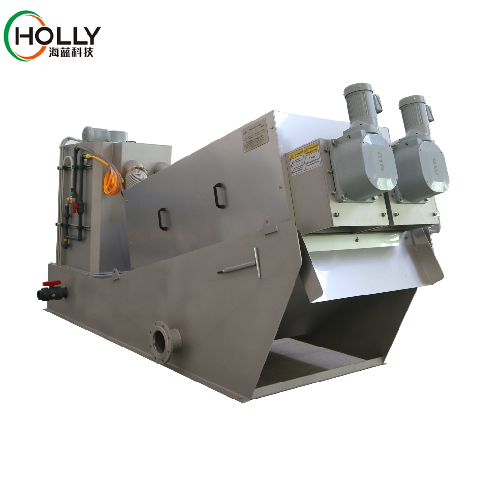 Sludge Dewatering Screw Press HLDS Multi-disc Sludge Dewatering Screw Press belongs to the screw press, it’s clog-free and can reduce the sedimentation tank and sludge thickening tank, saving the cost of sewage plant construction. HLDS using screw and the moving rings to clean itself as clog-free structure, and controlled by the PLC automatically, it’s a new technology that can replace the traditional filter press like belt press and frame press, the screw speed is very low, so it cost low power and water consumption in contrast to the centrifuge, it is a cutting edge sluge dewatering machine. Working Principle The conditioned sludge flows into the filter zones from the flocculation tank and is pushed forward to the discharging end. With the gaps between the thread of the shaft is getting even narrower the pressure on the sludge is getting higher and higher. Than the water is separated from the sludge and flows out from the gaps between the mo…