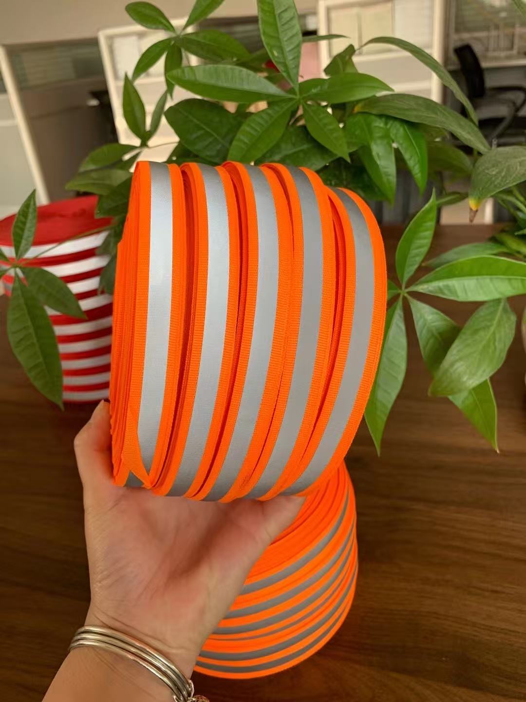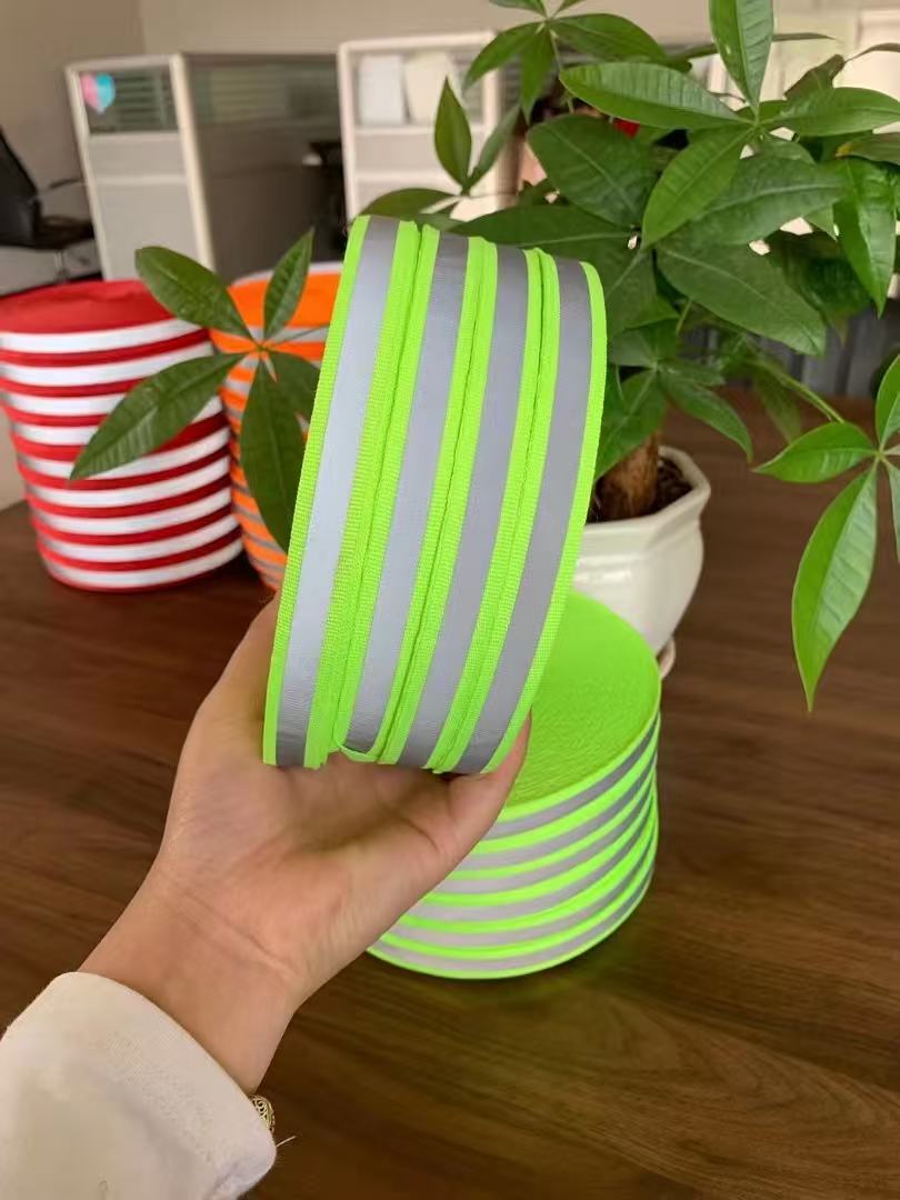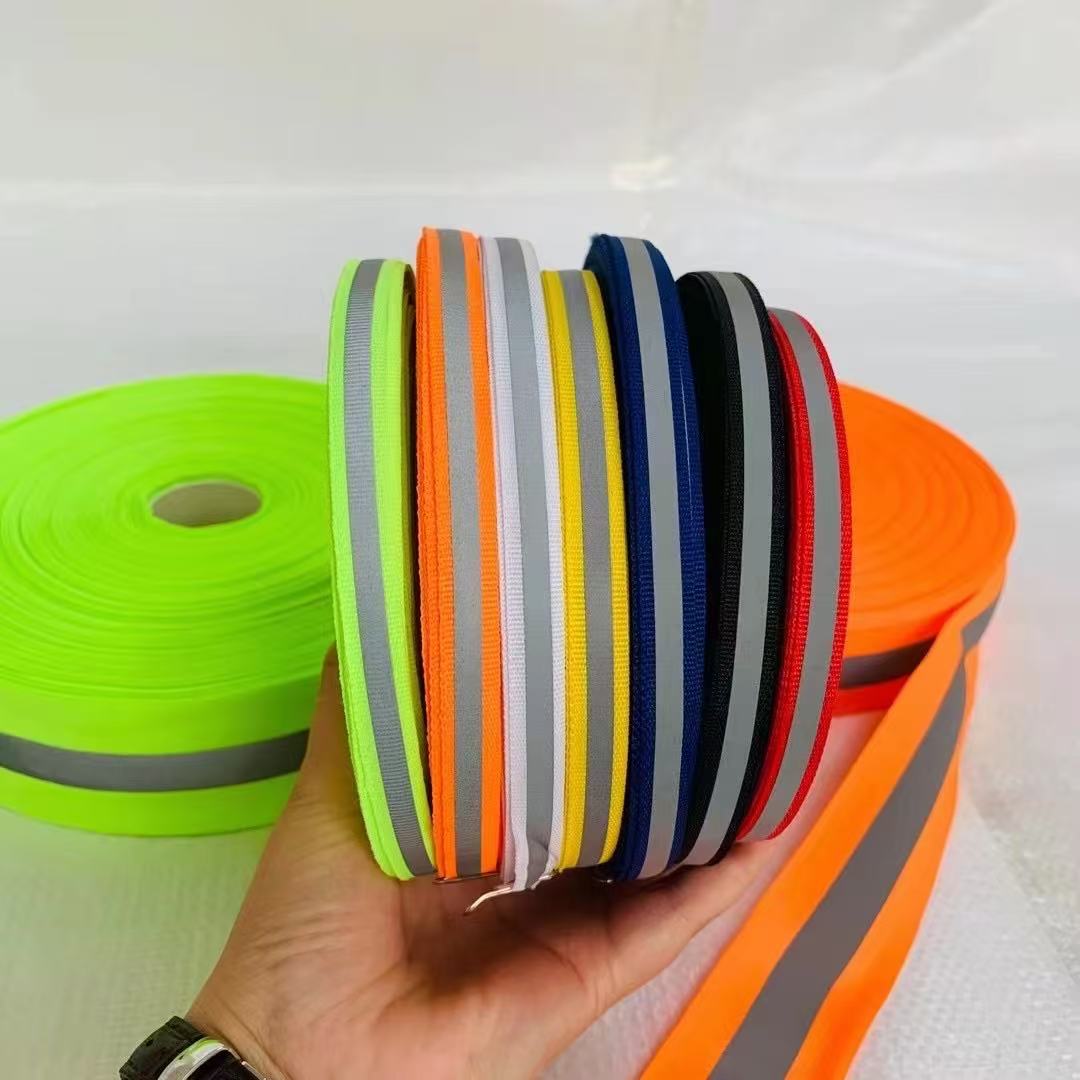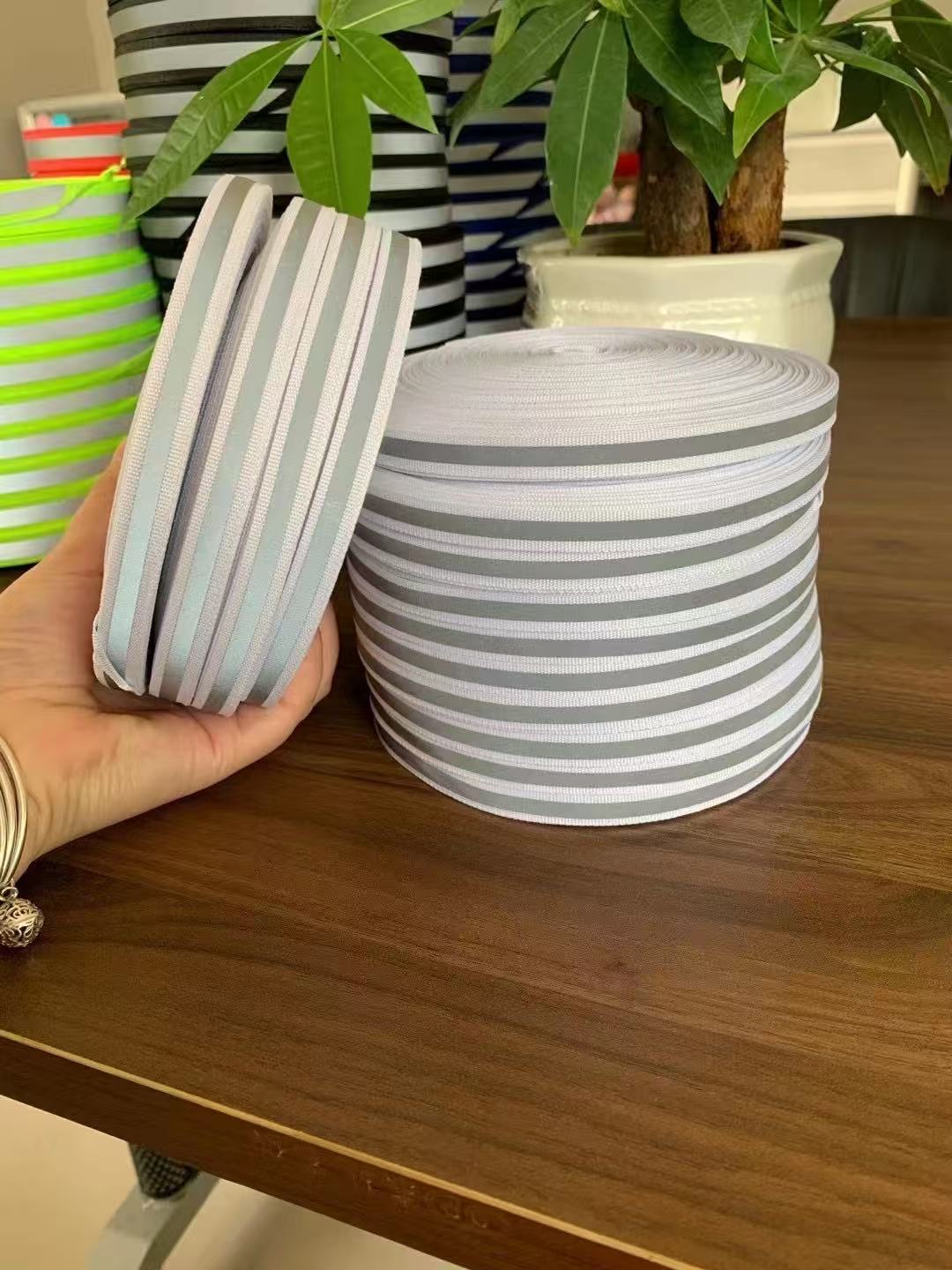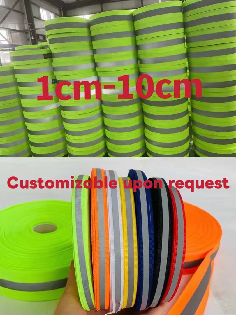 Small-size Reflective Webbing Our small-size reflective webbing is designed for precise application in outdoor clothing, safety vests, and workwear. • High Visibility: Adopts premium reflective materials, ensuring clear visibility in low-light/night environments (complies with EN ISO 20471 safety standards). • Multiple Colors/Styles: Available in striped patterns (e.g., black-white, orange-white) and bright neon colors, matching different garment designs. • Durable Performance: Resistant to washing, ironing, and wear; maintains reflective effect after long-term use. • Easy to Apply: Suitable for sewing or iron-on attachment, ideal for small-area safety enhancements (e.g., cuffs, straps). Primary Products: Reflective webbing, reflective elastic tape, reflective fabric, reflective film, reflective binding cord, flame-retardant reflective fabric