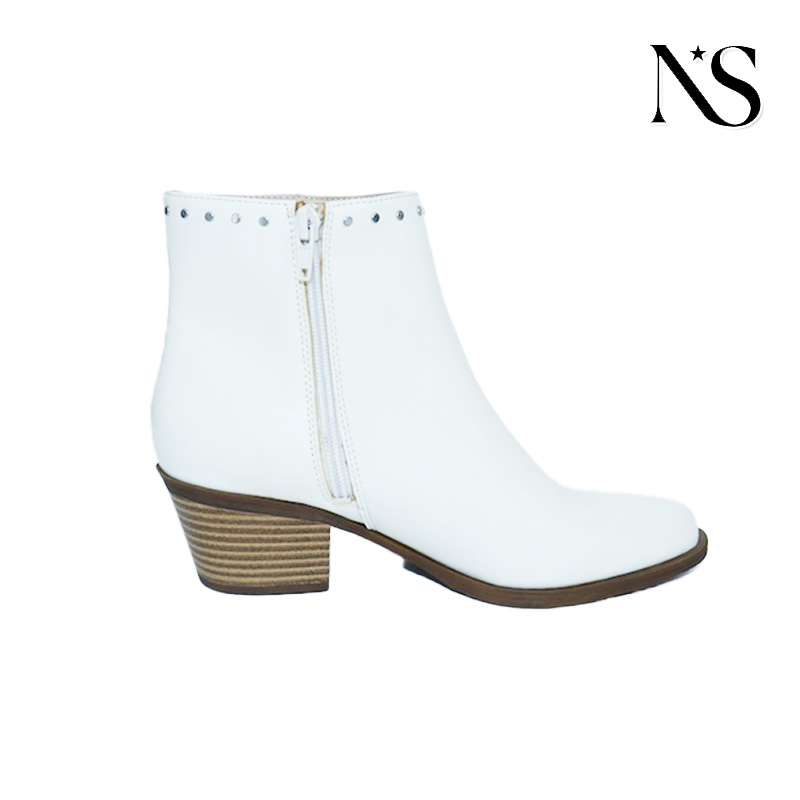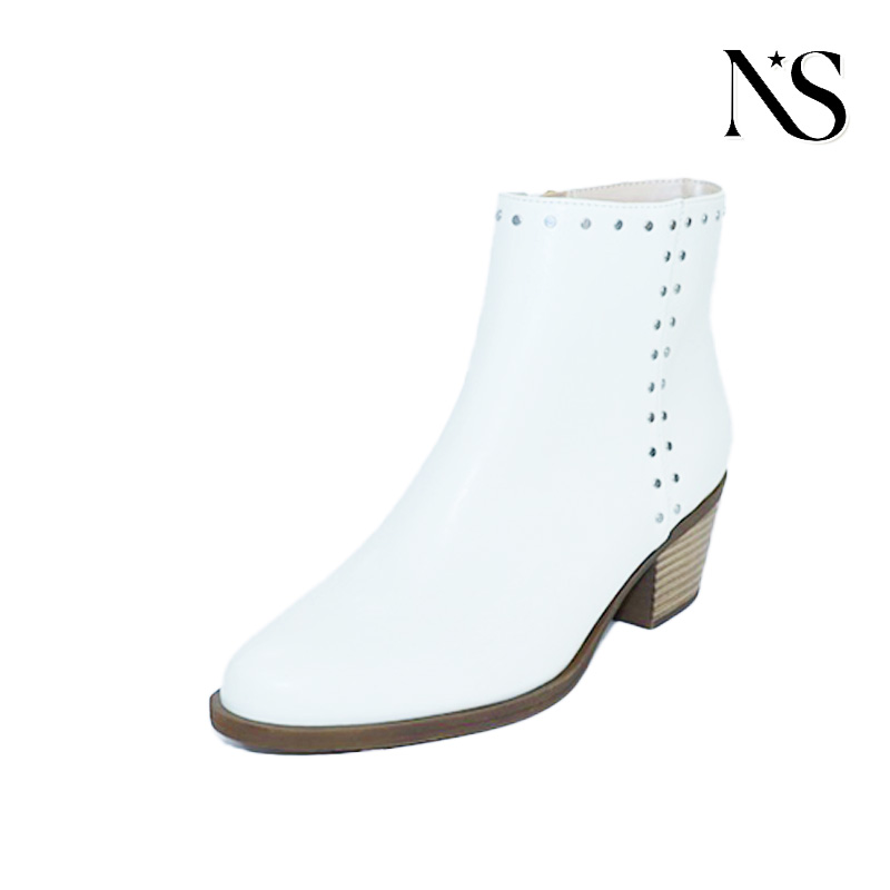 These women's white patent leather ankle boots are a vibrant blend of edgy style and everyday comfort, perfect for those who love to make a bold fashion statement. Crafted from high-quality white patent leather, they feature a glossy finish that catches the eye, while the stud embellishments along the ankle and side add a touch of edgy sophistication. The ankle-high design offers versatile styling, easily pairing with jeans, dresses, or skirts for a range of looks. The block heel provides a balanced lift, ensuring both height and stability, making these boots suitable for all-day wear—whether you’re exploring the city, attending a fashion event, or simply running errands. A side zipper allows for easy on and off, ensuring a secure and convenient fit. Inside, the boots are lined with soft material to enhance comfort during extended wear, and the durable outsole offers reliable traction on various surfaces. The premium patent leather construction guarantees longevity, making them…
